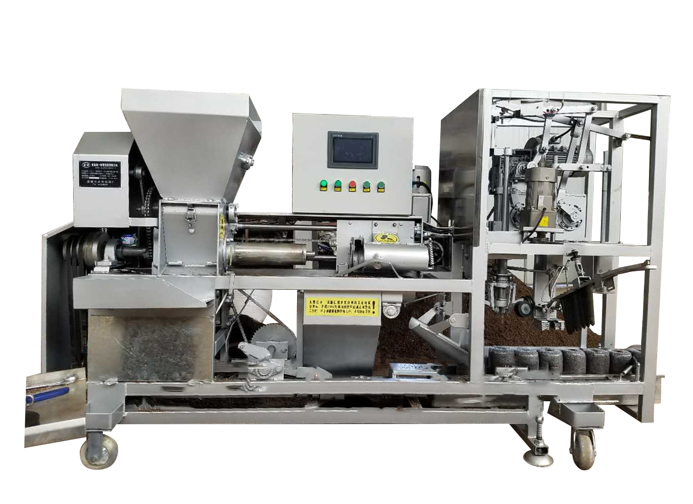 本產(chǎn)品設(shè)計(jì)簡(jiǎn)單,效率高、耗能低、省時(shí)、省力、適合大型菌包廠和中型個(gè)體加工戶使用,整體采用十二項(xiàng)國家發(fā)明專利。整機(jī)電路采用交流接觸器形式控制可靠,故障低,生產(chǎn)維護(hù)簡(jiǎn)單方便,裝袋機(jī)采用螺旋推進(jìn)送料,抱筒保護(hù)袋子,到達(dá)裝袋長度標(biāo)準(zhǔn)后自動(dòng)停止出料,絞龍頭和出料筒用耐磨材料,耐磨性好,減少更換次數(shù),窩口機(jī)部分用變速箱,箱體用全封閉焊接,灌注機(jī)油,免維護(hù),所有的窩口動(dòng)力輸出動(dòng)作都在變速箱內(nèi)完成,低速工作,磨損小,性能穩(wěn)定可靠,下棒機(jī)構(gòu)用機(jī)械動(dòng)作控制,每次工作只下一根菌棒,插入位置準(zhǔn)確。每次只需將袋子輕松套上,撥動(dòng)開關(guān)即可完成一次裝袋,倒散料窩口插棒壓平,讓裝袋變得簡(jiǎn)單輕松,讓工人從繁重的體力勞動(dòng)中徹底解放出來,比人工操作節(jié)省2個(gè)人工,菌袋的松緊,長度、窩口高度、松緊調(diào)節(jié)簡(jiǎn)單,整機(jī)的性能是目前國內(nèi)最先進(jìn)成熟穩(wěn)定的。
